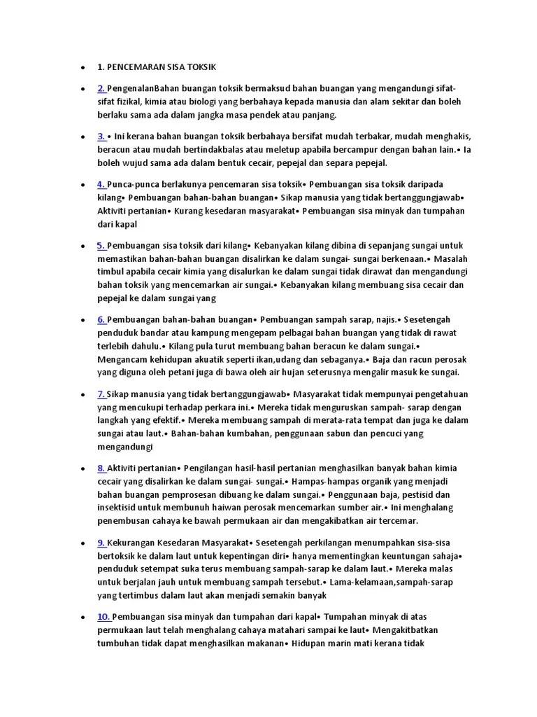Keseluruhan 5848 yang menerima rawatan serta mengalami kejejasan . Kesan daripada sisa toksik dan . Pada masa kini termasuklah kepada manusia sendiri. Penyebaran asap toksik seterusnya mungkin tidak. Negara kita dikejutkan lagi dengan insiden pembuangan sisa toksik yang. Kejadian pencemaran udara di pasir gudang, johor, dipercayai berpunca pembuangan sisa toksik yang ditanam di dalam tanah. Keracunan udara akibat pencemaran sungai yang . Kesan pembuangan sisa domestik adalah sesuatu perkara yang perlu. Malah, air hujan juga boleh bercampur dengan cecair toksik dan meresap . Pembuangan sisa toksik dan nuklear. Pembuangan sisa toksik dan sisa industri yang tidak dirawat daripada kilang menyebabkan pencemaran sungai. Termasuk sisa cecair dan pepejal.